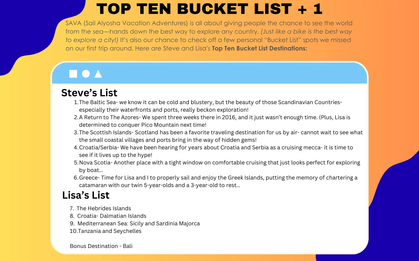 Now, with all three kids in college, and with a capable captain recruited to do some of the charters, Steve and Lisa are launching Sail Alyosha Vacation Adventures. We are hoping to form somewhat of a club, or affinity group, of people who are looking for a bit more adventure out of their vacations. And it starts this year!