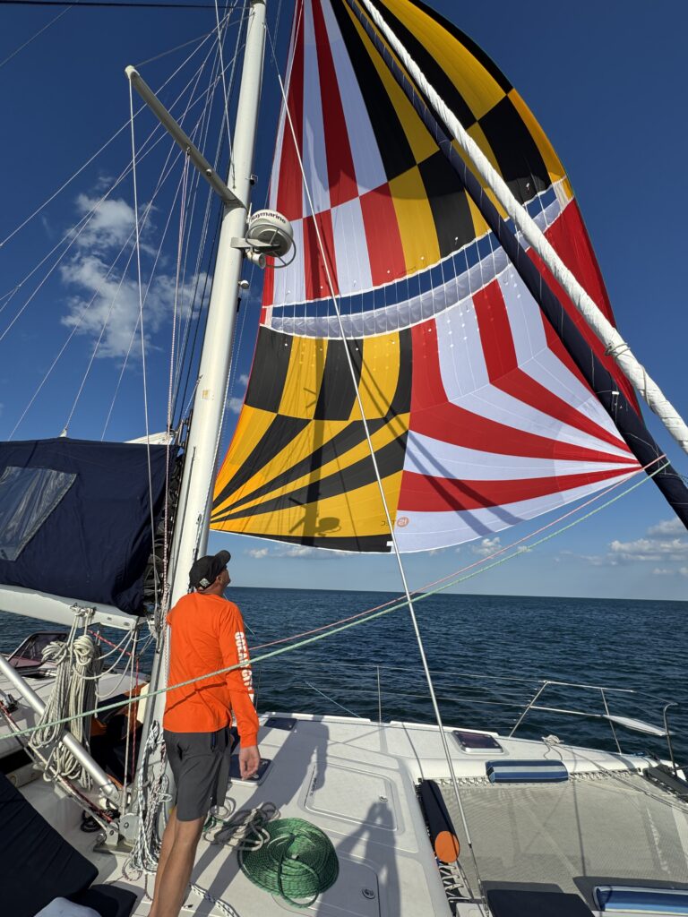 A spinnaker is a large, downwind sail — ours happens to be the colors of the Maryland flag, so you can’t miss it. On this trip, we head south into the wind and then turn around for a long, beautiful spinnaker run back with the wind behind us. It’s the highlight of the trip and the moment most people grab their cameras.